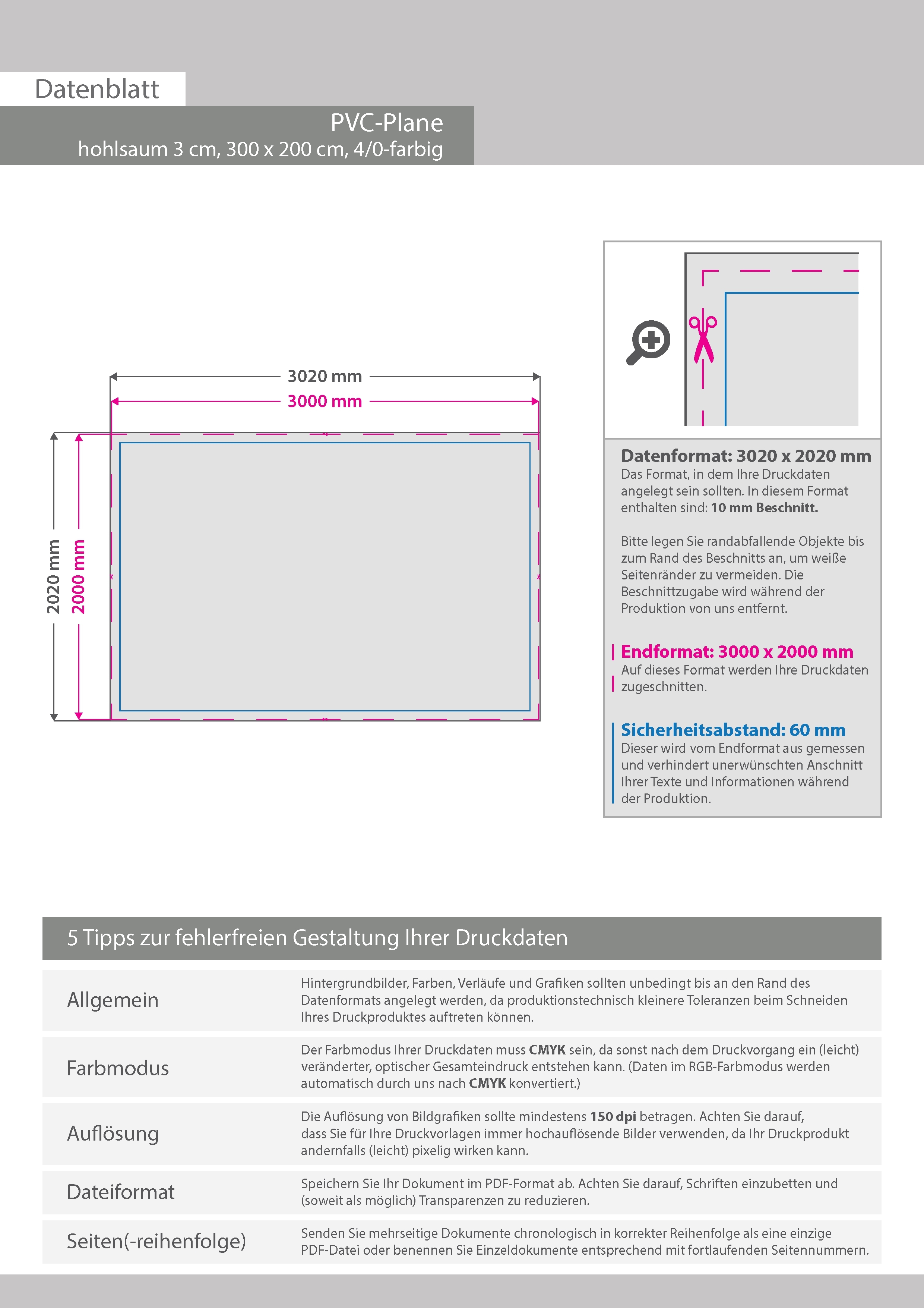 Hochwertige PVC-Plane 300 x 200 cm, 4/0-farbig bedruckt, Hohlsaum oben und unten (Durchmesser Hohlsaum 3,0 cm)
